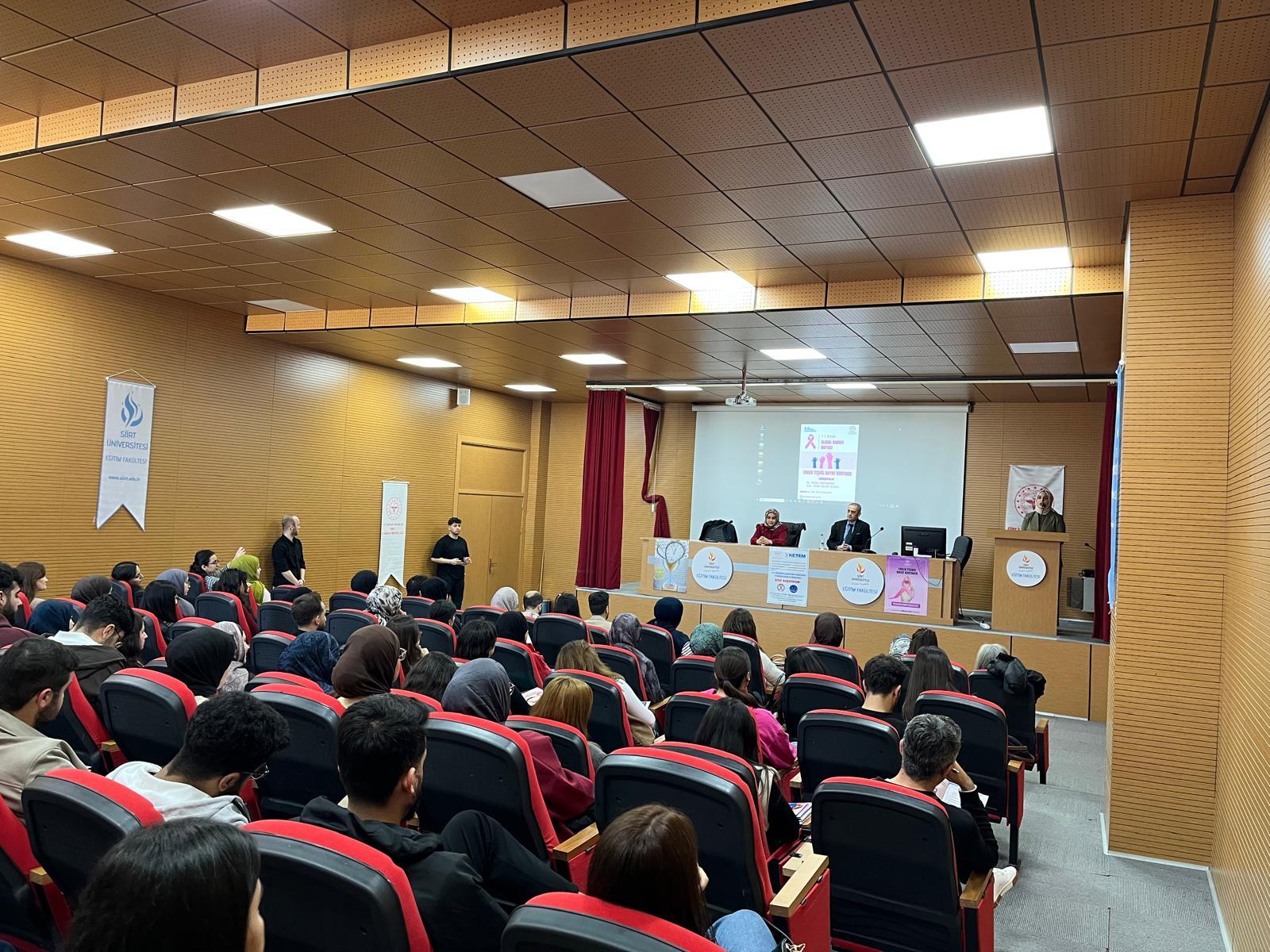 Eğitim Fakültesi konferans salonunda gerçekleştirilen etkinlikte, Siirt İl Sağlık Müdürlüğü’nden Dr. Büşra Eskifuruncu ve Uzman Fikret Bülent Sevgili konuşmacı olarak yer aldı. Geleceğin öğretmen adaylarının organizasyonunu üstlendiği programda, kanserde erken teşhisin önemi ve koruyucu sağlık hizmetleri detaylı bir şekilde ele alındı.