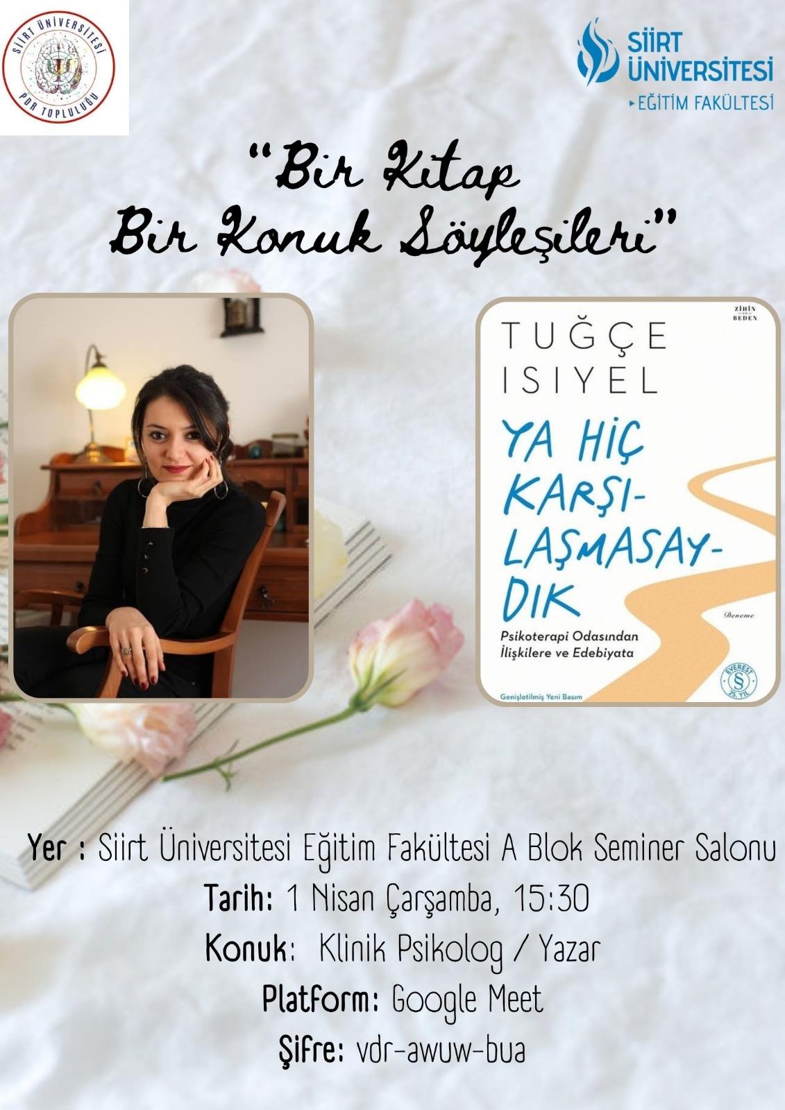 Siirt Üniversitesi PDR Topluluğu ve Eğitim Fakültesi işbirliğiyle "Bir Kitap Bir Konuk Söyleşileri" kapsamında alanımızın kıymetli hocalarının kaleme aldığı kitaplarla ilgili kendileriyle söyleşiler gerçekleştiriyoruz. Bu ayki söyleşimizi Klinik Psikolog Tuğçe Isıyel hocamızın "Ya Hiç Karşılaşmasaydık" kitabı üzerine 1 Nisan Çarşamba 15.30'da Siirt Üniversitesi Eğitim Fakültesi A Blok Seminer Salonu'nda yapılacaktır. Söyleşilerimize online katılım seçeneği de mevcuttur. Online katılımla ilgili bilgiler, duyuru afişinde paylaşılmaktadır.