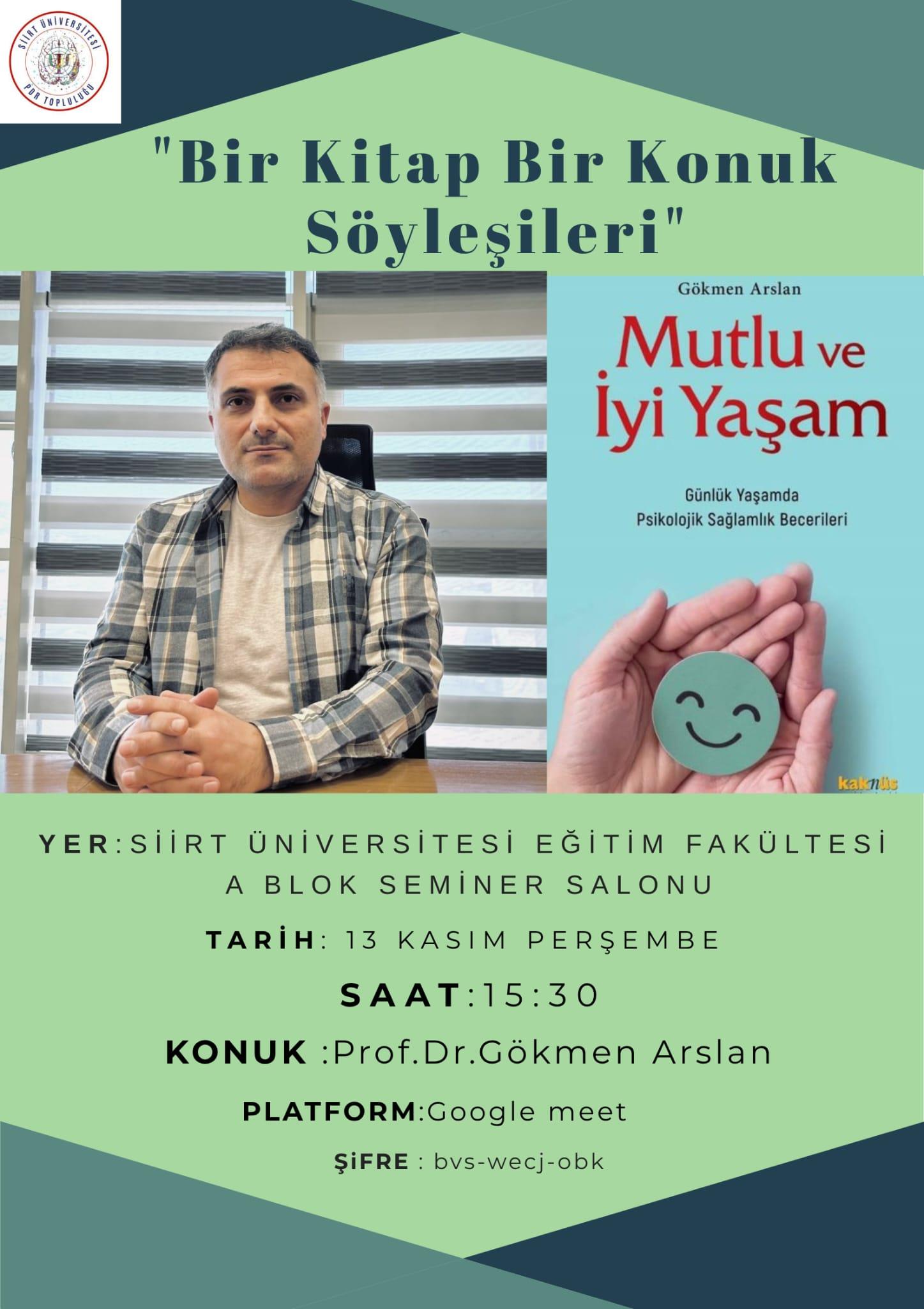 Siirt Üniversitesi Eğitim Fakültesi ve PDR Topluluğu işbirliği ile "Bir Kitap Bir Konuk Söyleşileri" kapsamında alanımızın kıymetli hocalarının kaleme aldığı kitaplarla ilgili kendileriyle söyleşiler gerçekleştiriyoruz. İlk söyleşimiz, Prof. Dr. Gökmen Arslan hocamızın "Mutlu ve İyi Yaşam" kitabı üzerine 13 Kasım Perşembe 15.30'da Siirt Üniversitesi Eğitim Fakültesi A Blok Seminer Salonu'nda yapılacaktır.